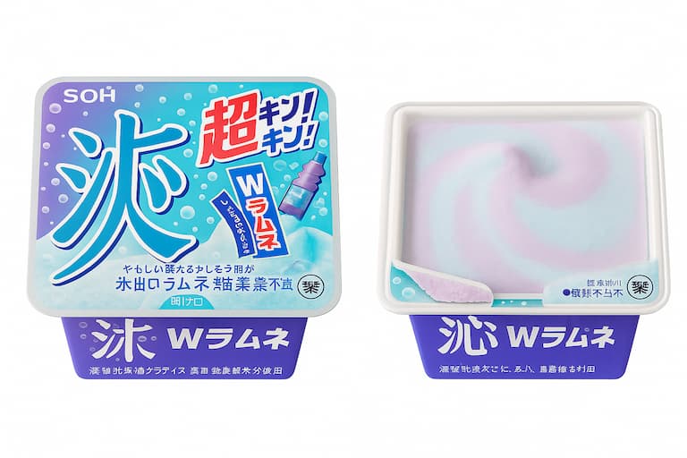- 爽やかなソーダ味と、フルーティーなグレープ味の2種類のラムネを同時に楽しめる贅沢仕立て。