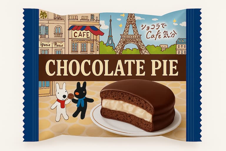 Each package shows the two characters enjoying the “Nama Choco Pie” in a Paris-inspired café setting.