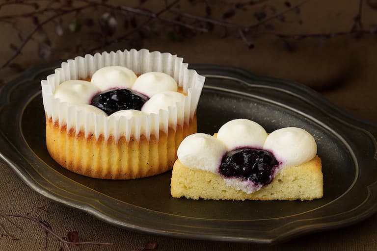 - 特長:ブルーベリーの果肉感を残した生地に、ポピーシードを練り込み、香ばしさと食感をプラス。ホイップクリームを花模様に絞り、華やかに仕上げた一品。