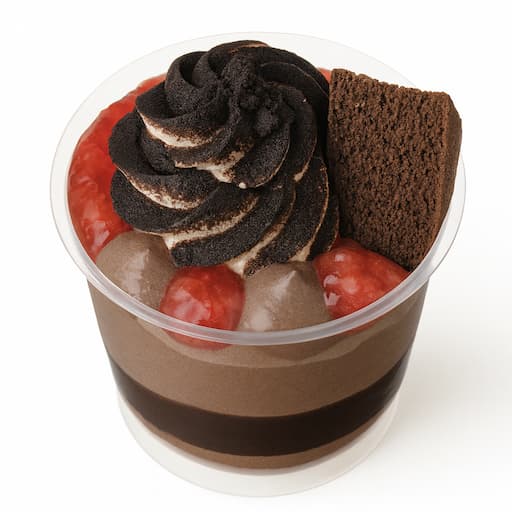 ブラックココアのスポンジケーキといちごソースの組み合わせで、見た目も味わいもリッチなパフェに仕立てられています。