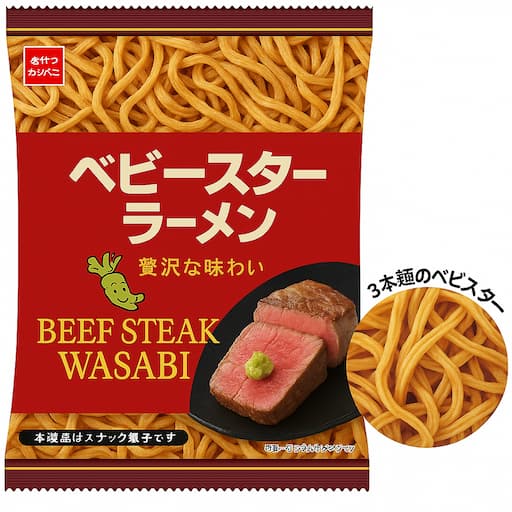 | 商品名 | ベビースターラーメン(松阪牛ステーキ味わさび風味) |