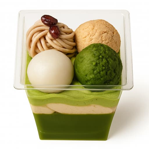 An indulgent Japanese-style parfait layered with matcha milk pudding, chestnut whip, and matcha mousse, then topped with Mont Blanc-style chestnut cream, sweet beans, warabi mochi, and shiratama dumplings.