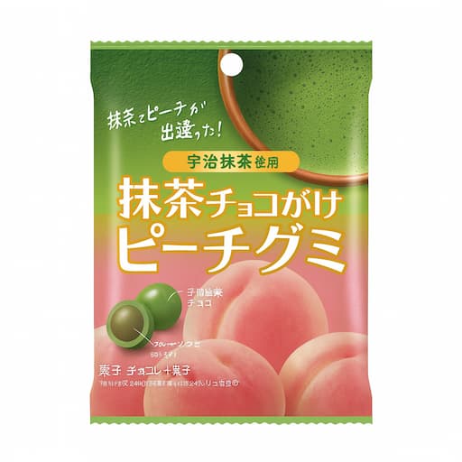 宇治抹茶チョコのほろ苦さと、ピーチグミのフルーティーな甘みが絶妙に調和した、全く新しいおいしさのグミチョコレートが登場! 宇治抹茶の深いコクと、ピーチグミのジューシーな甘さが融合し、ユニークで驚きの味わいを楽しめます。