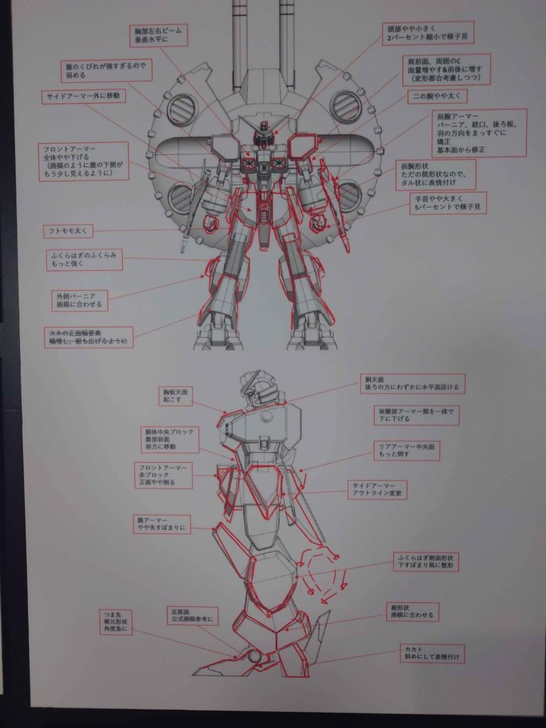 入口付近には、デザイン修正メモ(赤字)入りの設計画も展示されていて、