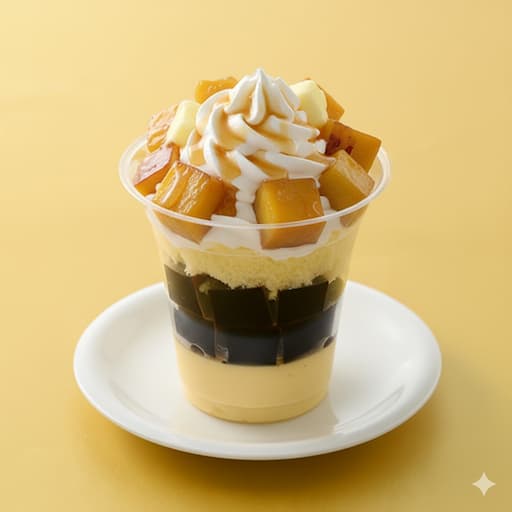 さつまいもプリン・角切りカラメルゼリー・いも風味ミルクムースを重ね、