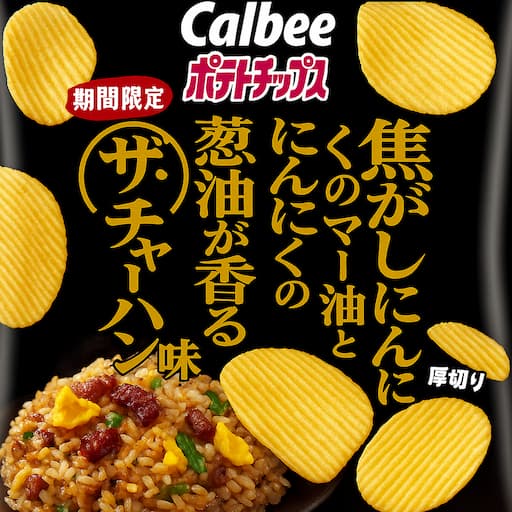 ポテトチップス ザ★チャーハン味は、にんにくや葱、豚のうま味が広がるガツンとした味わいで、Vカットの形で食べ応えがあり、金字と赤背景のあるインパクトあるパッケージになりました。