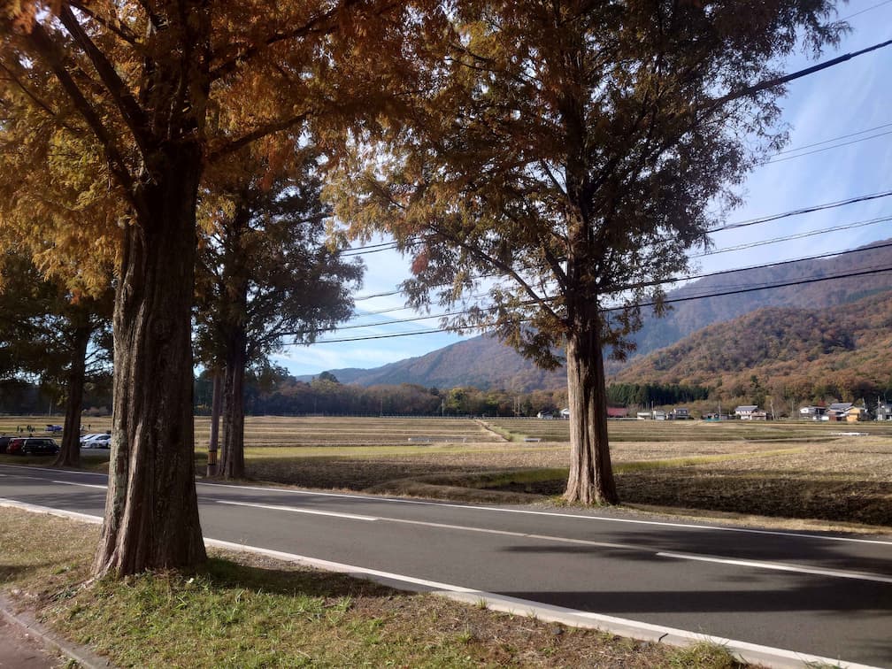 紅葉のメタセコイアと、のどかな風景の組み合わせが美しい。