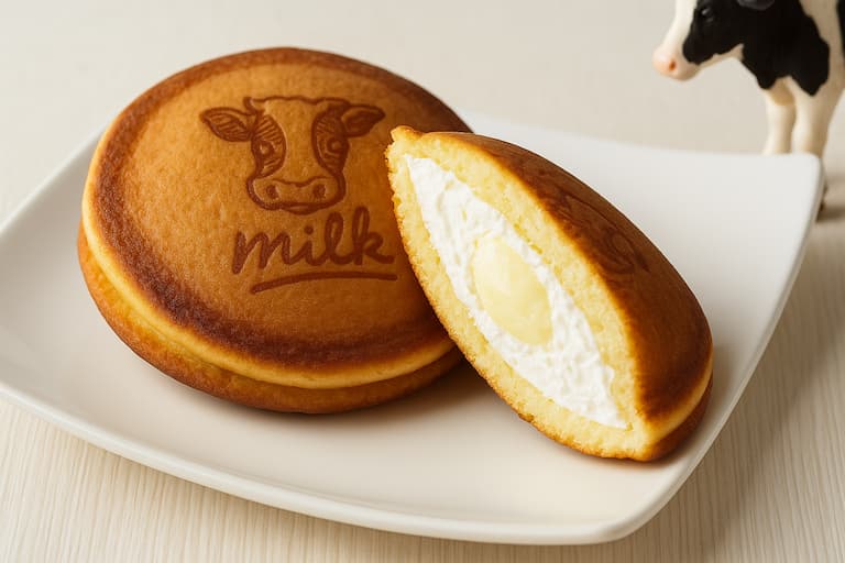 A soft and chewy dorayaki filled with rich milk cream and thick milk sauce.