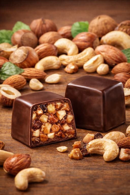 The roasted aroma of almonds, the mild sweetness of cashews, and the rich flavor of hazelnuts blend well with the crunchy chocolate base.