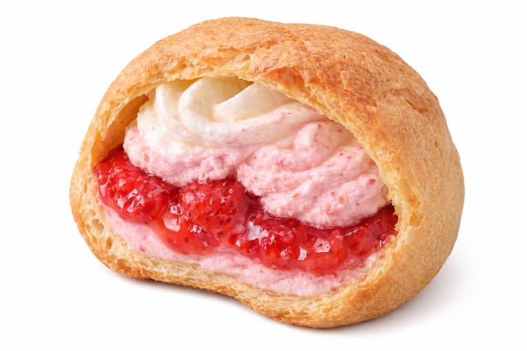 The Strawberry Double Cream Puff combines two strawberry components at once: a tangy strawberry sauce with fruit pieces and a light strawberry whipped cream, creating a well-balanced contrast inside a classic choux pastry.