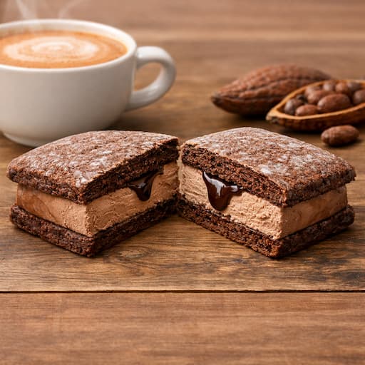 Milk cocoa ice cream with chocolate sauce is sandwiched between soft cocoa cake.