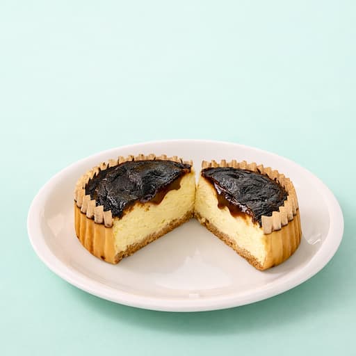 This cheesecake features a caramelized, slightly burnt top and a rich, creamy inside.