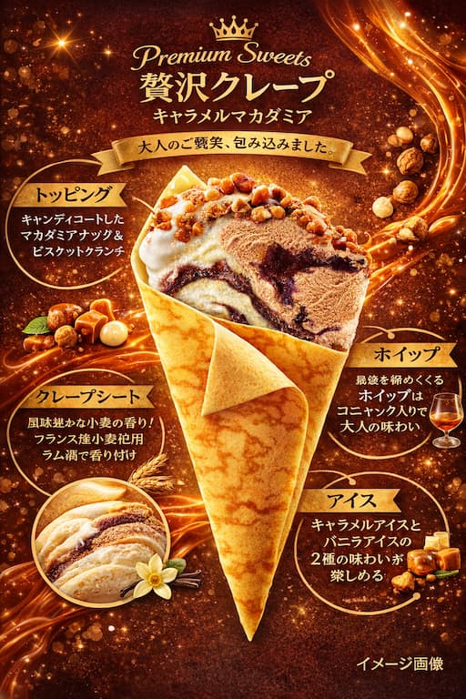 2026年1月19日発売の新作は、もちもちクレープにキャラメルアイスとマカダミアナッツを組み合わせた