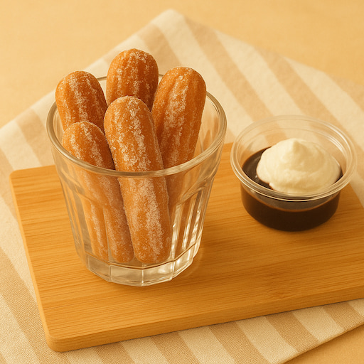 外はカリッと、中はふんわりとした食感の焼きチュロスに、別添のチョコソースとホイップクリームをディップして楽しむ、満足感たっぷりのスイーツです。
