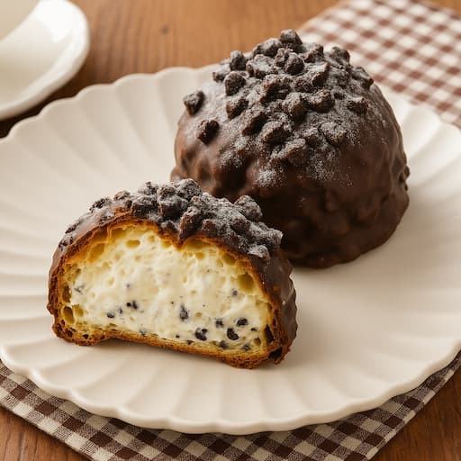 外はザクザク、中はとろけるクリーム。「クッキー&クリームシュー」は、香ばしいチョコクッキーをトッピングしたシュー生地に、なめらかなクッキー&クリーム風ホイップをたっぷり詰めた、満足感たっぷりの一品です。食感と味わいのコントラストが楽しく、ひと口ごとに新しいおいしさに出会えます。