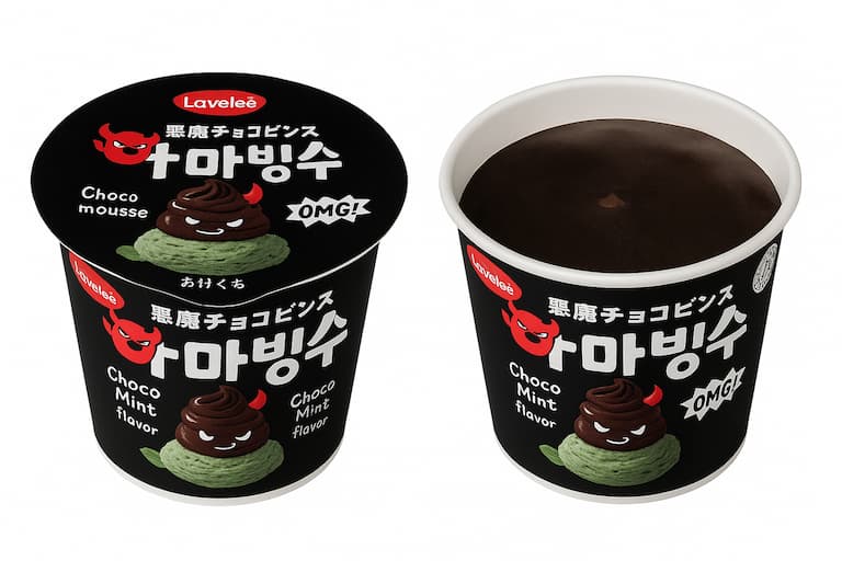 【悪魔チョコビンス】は、見た目も味もインパクト抜群の3層構造かき氷スイーツ。チョコミント好きにはたまらない、まさに“悪魔的な”美味しさを楽しめる商品です。