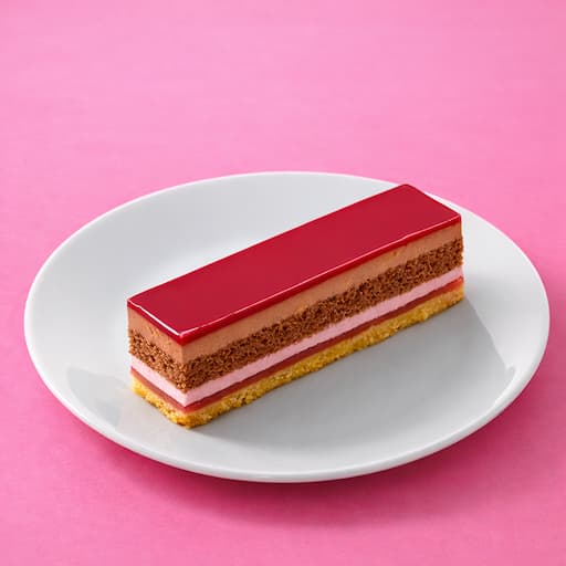 It has six layers including chocolate coating, chocolate mousse, cocoa sponge, raspberry mousse, raspberry jelly, and crumble.