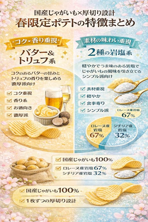 近年、期間限定スナックは“濃厚化”の傾向が強まっていますが、2026年版の春ポテトは「香り」と「素材感」に軸を置いたバランス型リニューアルといえそうです。