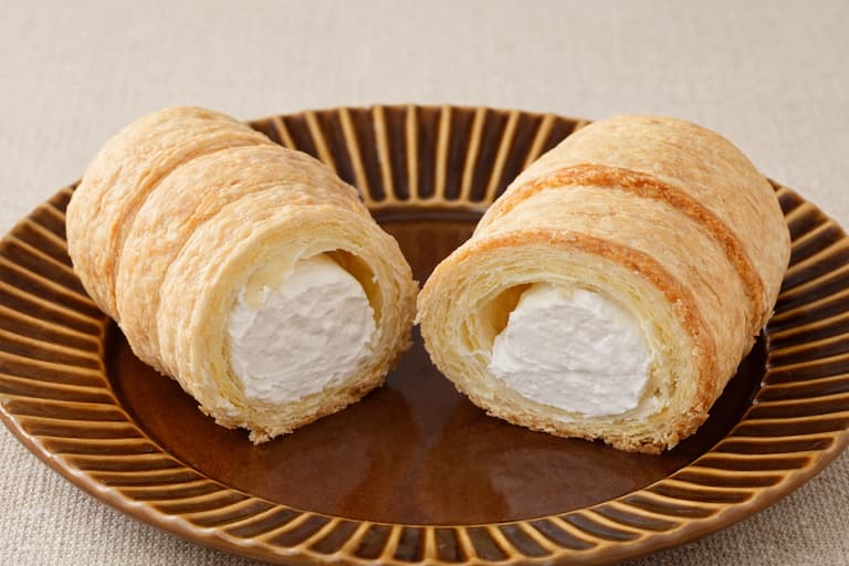 サクッとしたパイ生地の中に、北海道産牛乳入りのホイップクリームを詰めた、王道タイプの甘い系パンです。