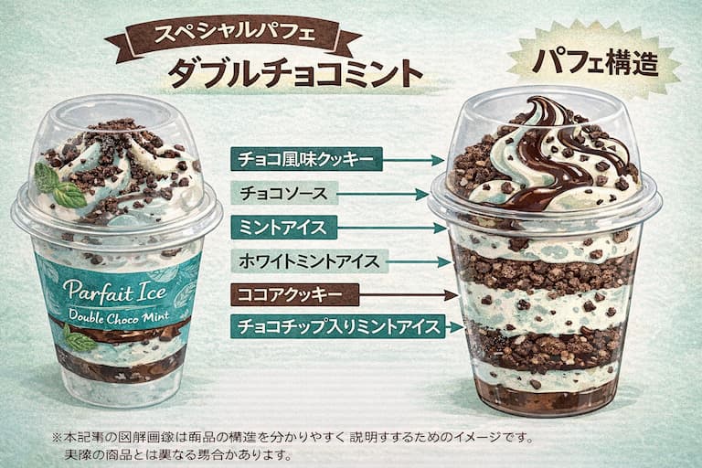 ミントの爽快感とチョコの甘さのバランスを重視した、チョコミントパフェ型アイスになりそうです。ホワイトミントアイスが入ることでミントの清涼感が少しやわらぎ、ミント初心者でも食べやすい仕上がりになる可能性があります。
