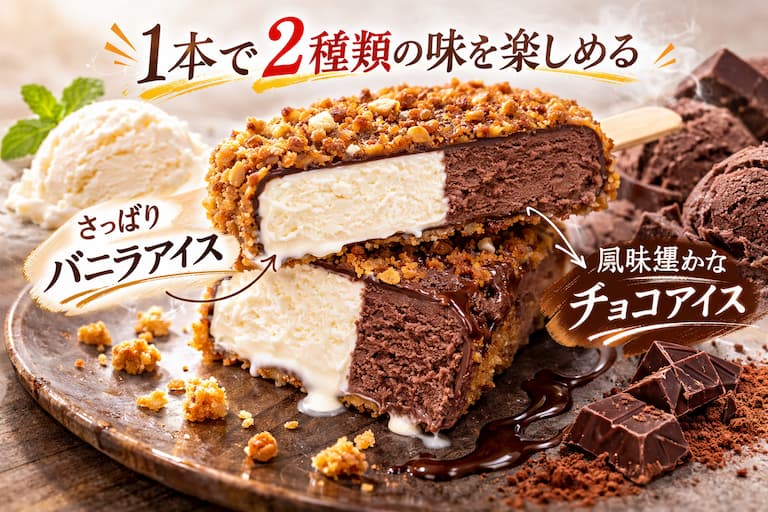 今回の新作は、バニラとチョコの2種類のアイスを1本で楽しめる設計。食べ進めるごとに味が変わる構成が特徴です。
