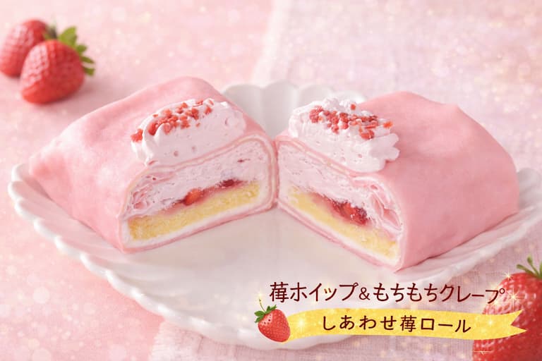 いちごソースの甘酸っぱさ × クリームのミルキーなコク × クレープ生地のやさしい甘さ。「軽やかに食べられるいちごショートケーキ風スイーツ」がイメージされます。