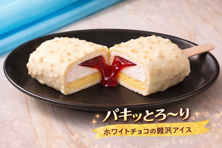 「パキッ・カリッ・ザクッ・とろっ」の4つの食感を一度に楽しめるチーズケーキ風アイス。ホワイトチョコのコーティングと内部の層構造により、食べ進めるごとに変化する食感が最大のポイントです。