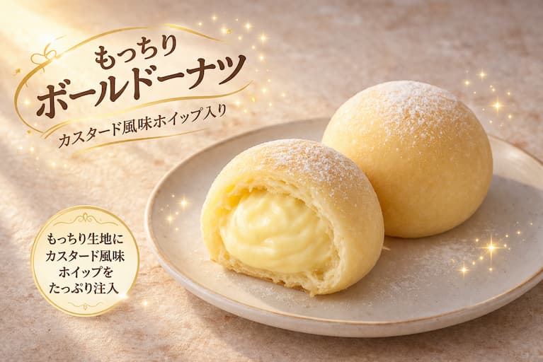 | ぼーるドーナツ カスタード風味ホイップ | 140円 | 3/31〜 | 約250〜320kcal(2個) | ★★★★★ |