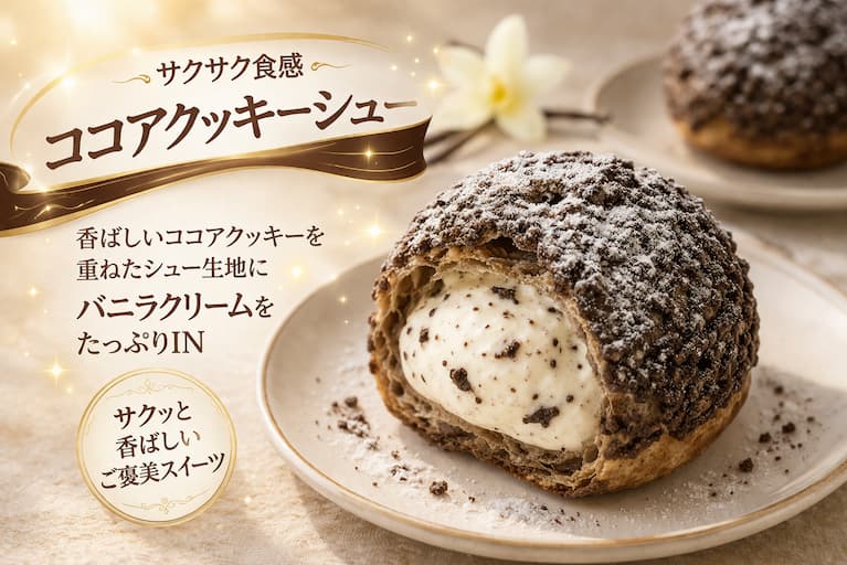 バニラクリームのコク × ココアクッキーのほろ苦さ × シュー生地の香ばしさの組み合わせで、「クッキー&クリームアイスをシュークリームにした味」に近いイメージ。甘すぎず重すぎない、食べやすい濃厚系です。