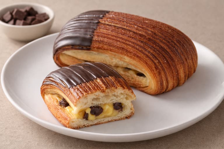 表面がサクッと軽く内側がしっとりとした2種類のクロワッサン生地に、カスタードクリームとチョコチップを挟んだデザート系パンです。食感と味の両方に変化を持たせた構造が特徴です。