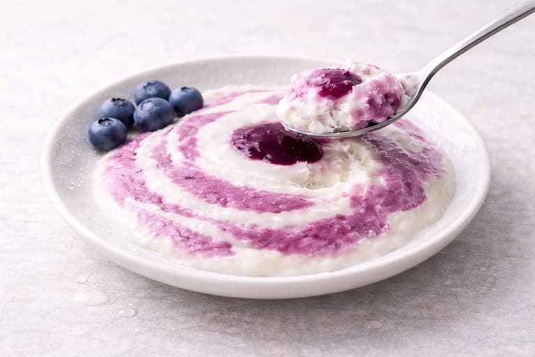 また、2色のぐるぐる構造により、スプーンを入れる場所によってブルーベリーとヨーグルトの混ざり具合が変わり、食べ進めるごとに味の変化を楽しめます。全体的に「シャリシャリ×甘酸っぱい×すっきり」の三拍子が揃い、最後まで重さを感じずに食べられる構成です。