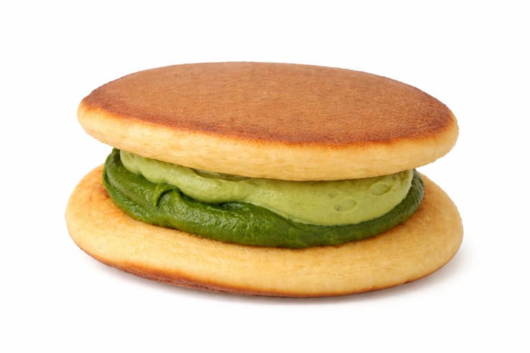抹茶あんと抹茶ホイップを重ねた「二層仕立て」が特徴のどら焼きです。もち小麦粉を使ったふわふわ・しっとりの生地と組み合わせることで、軽さとコクを両立した構造になっています。